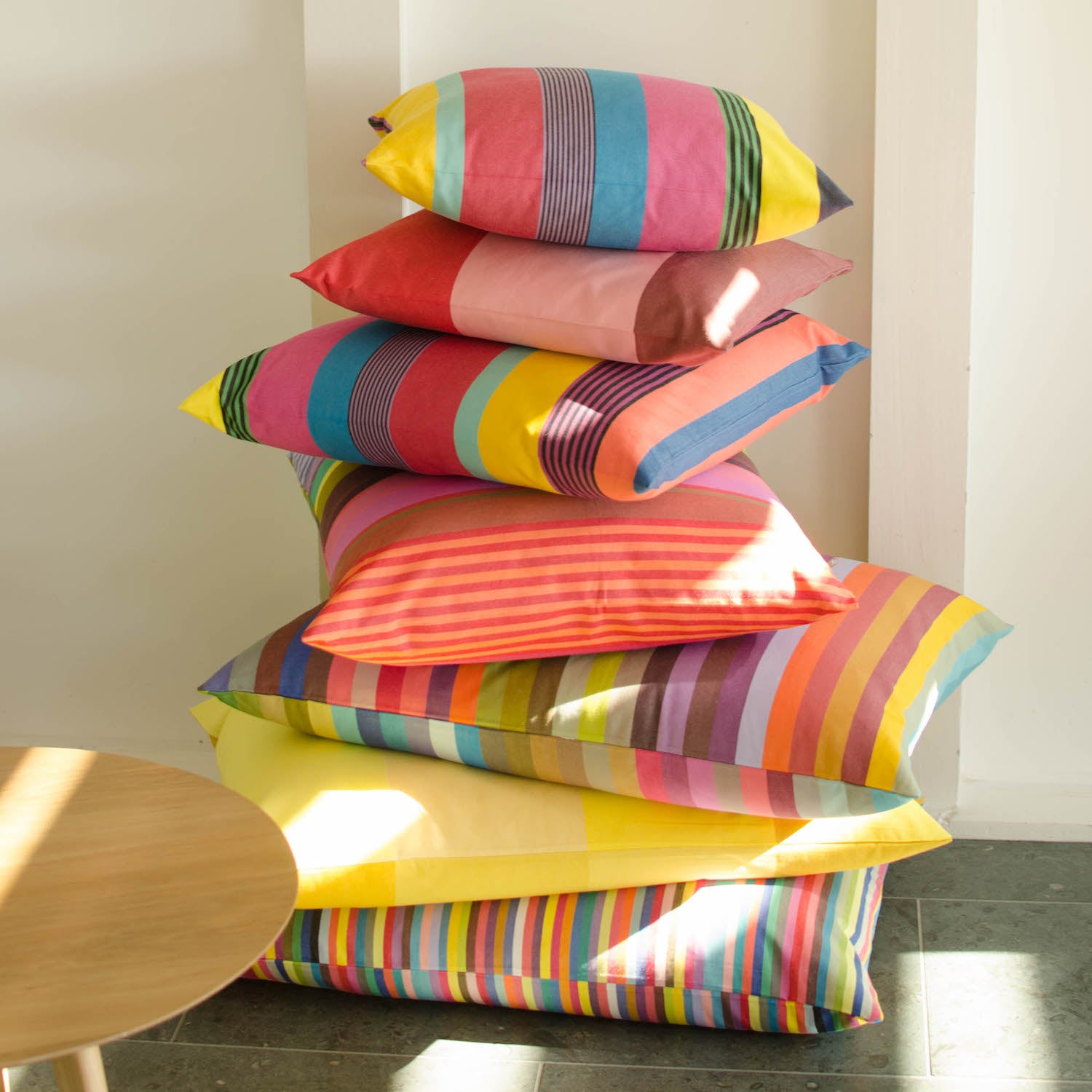 Bij kleurmeester verkopen en maken wij alléén woonproducten en textiel die in onze ogen iets speciaals hebben. Wij zijn dol op spannende combinaties in kleur, textuur en materiaal, die voor een opgewekte en energieke sfeer zorgen. Ons vakmanschap en creativiteit staat garant voor een unieke collectie kussens, stoffen, inklapbare tuinmeubelen, tafellinnen, tassen en ‘op maat’ producten.