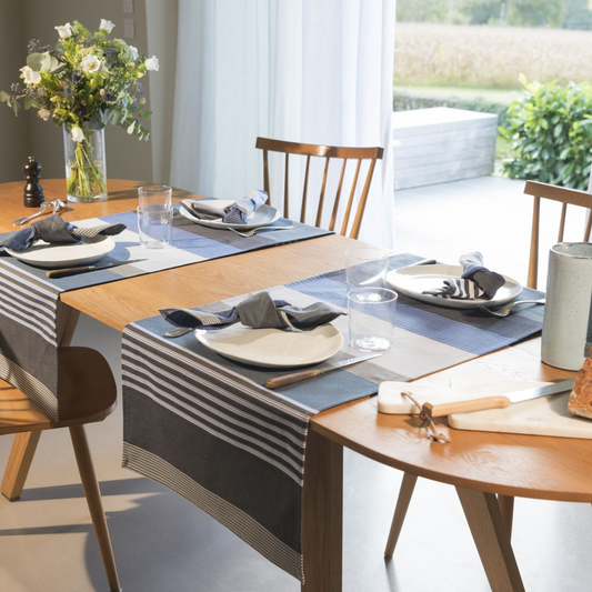 Miramar heef deze katoenen stof van 185 cm breed. De stof heeft mooie onregelmatige strepen in een kleurcombinatie van grijs, konings blauw, donkerblauw, zwart en wit.
