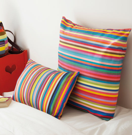 Katoenen stof Salvador met haar kleurrijke regelmatig geweven strepen motief is een vrolijke interieur stof.