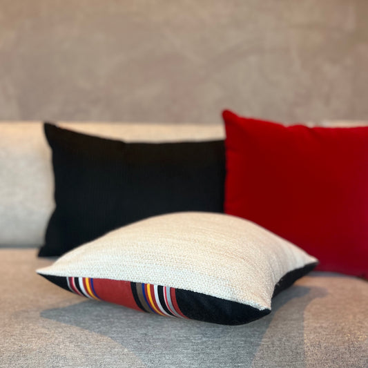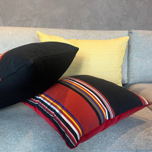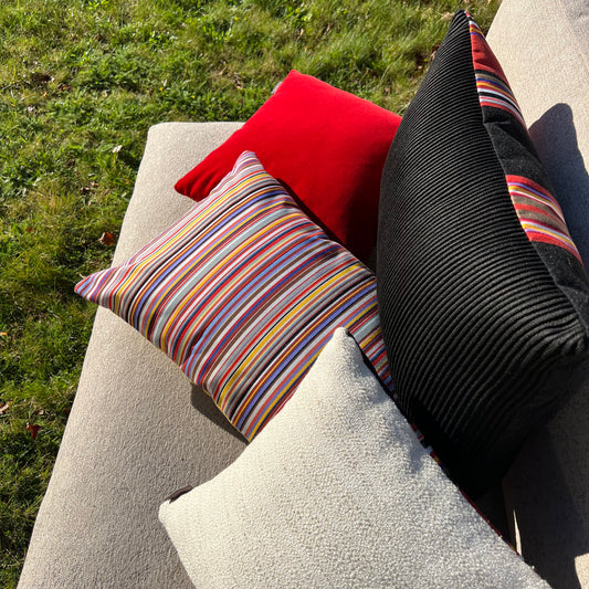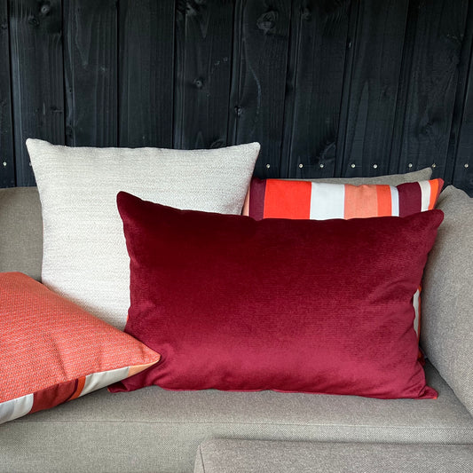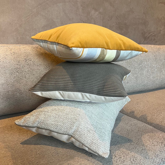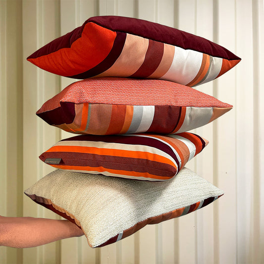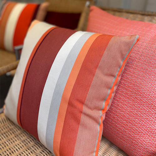 Deze bijzondere sierkussen hebben twee unieke kanten: een zijde gemaakt van een warme, zachte outdoor stof met textuur en de andere zijde gemaakt van een van onze kenmerkende outdoor streepstoffen. Een fijne mix van kleuren wat deze veelzijdige kussentjes een zacht, warm en levendig gevoel geeft.