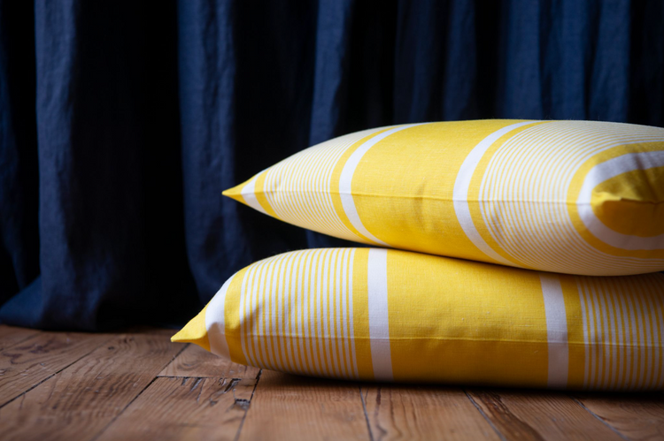 Fabric Yvonne yellow white is also available as a canvas fabric of 43 cm wide, for your chair, stool or bag with some extra sunshine!