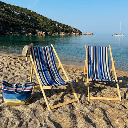 The subtle blue tones and cheerful stripes of roy outdoor fabric immediately remind you of the Mediterranean.