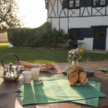 Wat een beauties deze diep groene gestreepte afwasbare placemats chiberta. Handig en mooi op bijvoorbeeld een houten tafel! Even afnemen met een nat doekje en de waterafstotende placemats zijn klaar voor volgend gebruik!