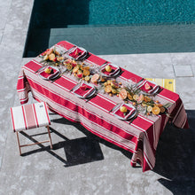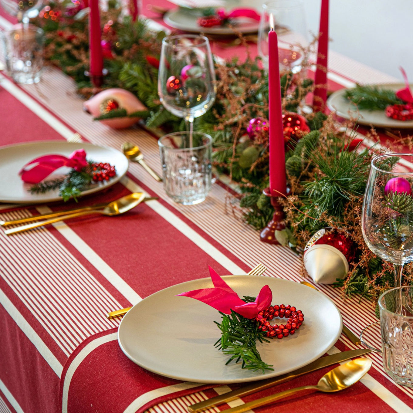 Dit 60% katoenen en 40% linnen tafelkleed heeft een mooie linnen structuur en door haar kleurrijke rode en witte strepen creëer je direct een sfeervolle aangeklede tafel.