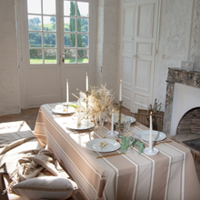 Verkrijgbaar in 3 maten. De breedte van het tafelkleed is 170 cm. De strepen volgen de lengte van het katoen-linnen tafelkleed.