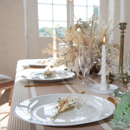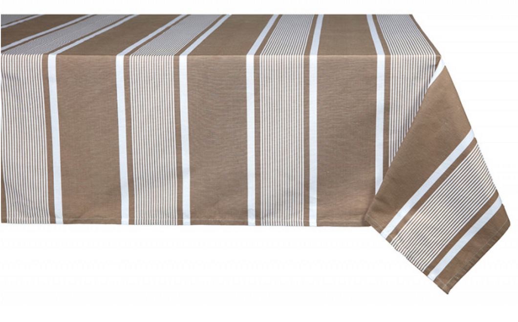 Dit 60% katoenen en 40% linnen tafelkleed heeft een mooie linnen structuur en door haar mooie regelmatige taupe en witte strepen creëer je direct een sfeervolle aangeklede tafel.