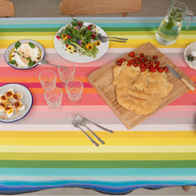 Stof met coating Marquises heeft een perfecte mix van frisse kleuren dat met haar regelmatig geweven strepen een vrolijk en zomers gevoel geeft. Staat prachtig als tafellinnen op een houten tafel.