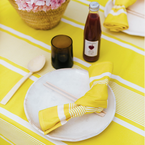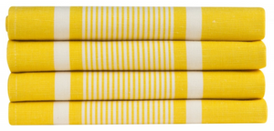 De zon aan tafel met deze katoen linnen servetten Yvonne maken met haar geel witte strepen en een leuke linnen structuur. Leuk om te combineren met afneembaar tafelkleed yvonne geel met coating.