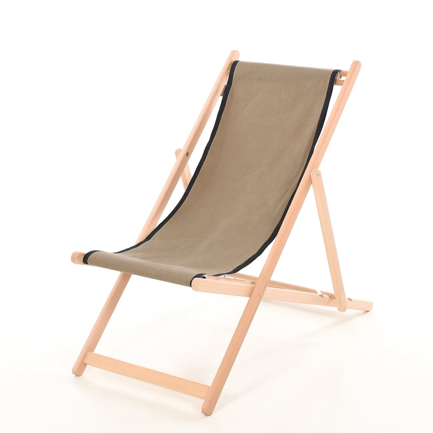 Het beukenhouten frame is opklapbaar en in 4 standen verstelbaar. De loper wordt door 2 latten in de zoom aan de stoel bevestigd. Dit maakt de stof afneembaar en wasbaar.