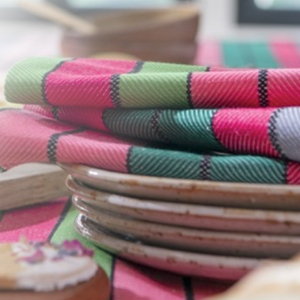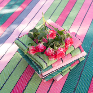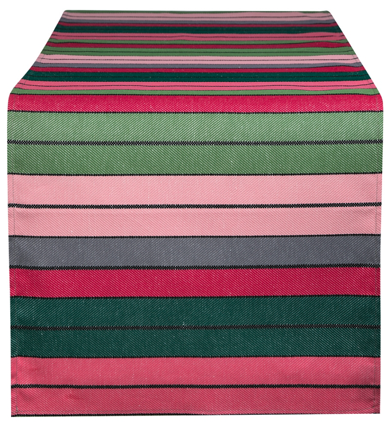 Creëer een stijlvol gedekte tafel met onze fris groen en roze gestreepte tafelloper Eugenie. De strepen zijn geweven met een zigzag structuur wat de tafelloper nog een beetje extra elan geeft.
