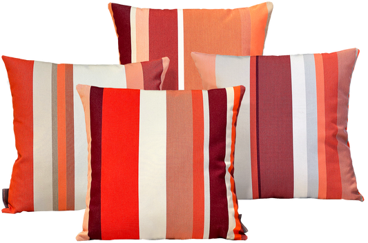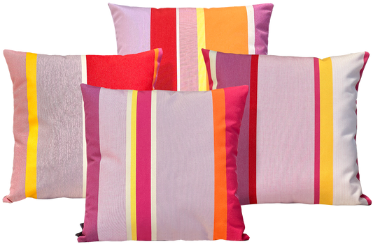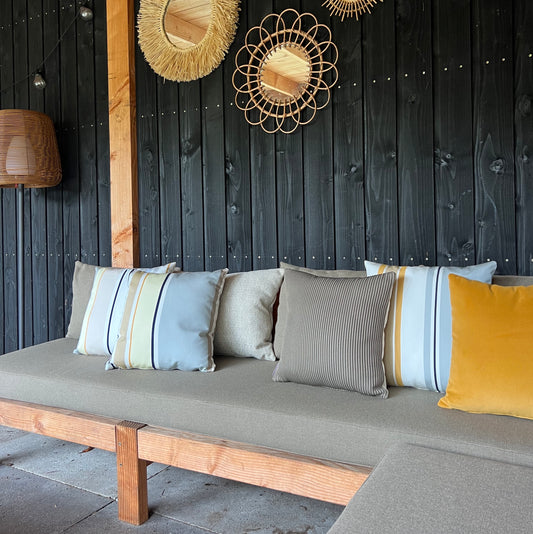 Naast onze gestreepte outdoor kussens bieden we ook sierkussens voor buiten aan van outdoor stoffen met andere texturen. Bij deze veelzijdige luxe sierkussen lijn combineren we onze streep stoffen met bijvoorbeeld fluwelen outdoor stof, boucle outdoor stof of jacquard outdoor stof. Dit geeft een extra speelse, luxe sfeer en extra comfort.