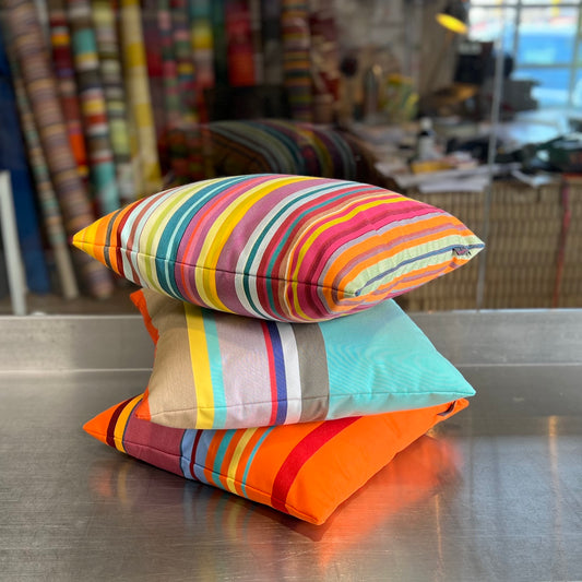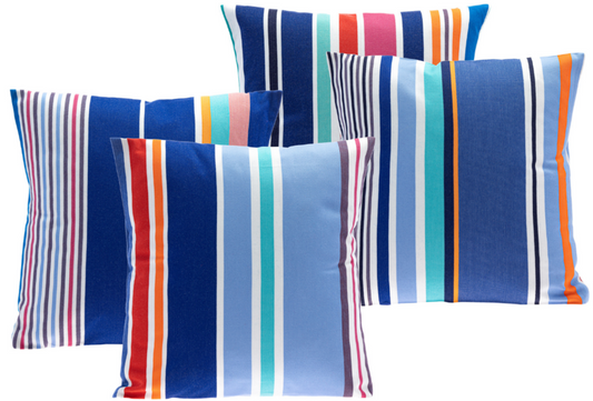 Kleurmeester heeft diverse kleuren, strepen en ontwerpen in mooie combinaties in haar outdoor stoffen collectie. Hier maken we onze fraaie buitenkussens van. Mix & match kleuren, strepen en designs voor een speels en vrolijk effect. Je kunt kiezen uit onze online outdoor kussens-collectie of je kunt je wensen betreffende jouw kussens voor buiten doorgeven. Dan maken wij jouw gepersonaliseerde buitenkussen voor je op maat.